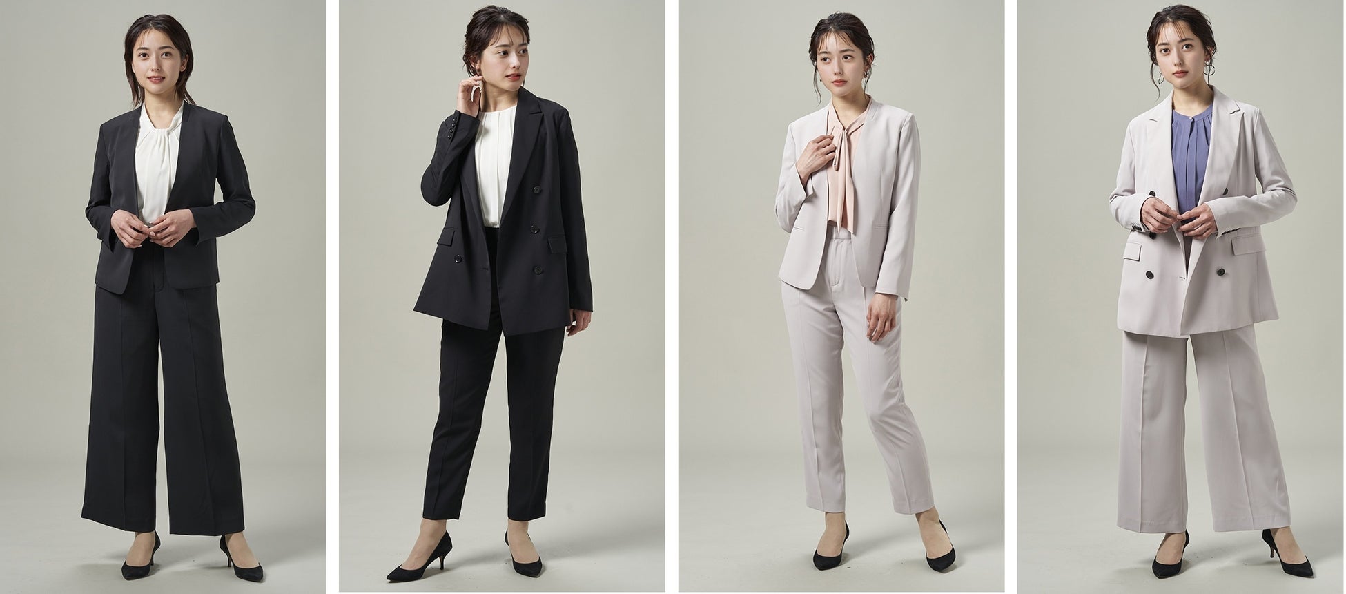 独特のウェーブ状の凹凸感があり、滑らかな風合いを持つクレープ生地を使用したセットアップは、上品でエレガントな印象を演出し、オフィスカジュアルなスタイリングからオケージョンスタイリングまで幅広いシーンで活躍します。今回はベーシックできちんと感のあるノーカラージャケット、テーパードパンツと適度なリラックスシルエットでトレンドを意識したこなれ感のあるダブルジャケット、ワイドパンツのジャケット2型、ボトム2型をご用意しました。明るめでフェミニンなイメージのライトグレーと、ブラック見えする深めのネービーの2色展開です。上下ともウォッシャブルでシワになりにくく、高ストレッチで動きやすい機能性も兼備した一着です。