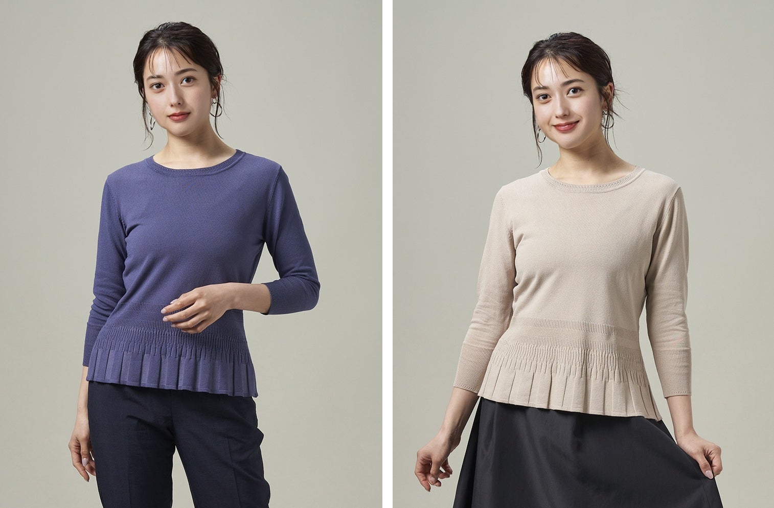 夏シーズンのスタイリングに取り入れやすく肌なじみ良いサンドベージュ、涼し気なブルーをトレンドのくすみカラーに仕上げた2色展開のニットは、ウエストラインがきれいに見え、フェミニンさも演出してくれるペプラム仕様です。スーツスタイルのインナーとしてはもちろんのこと、1枚で着用してもスタイリングの主役になる一着です。アンサンブルとして着用可能な同シリーズのカーディガン展開いたします。